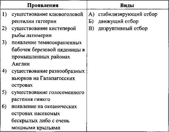 21. Установите соответствие между проявлениями естественного отбора и его видами.
