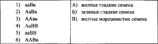 21. Установите соответствие между содержанием первого и второго столбцов, где А — доминантный признак желтой окраски семени а — рецессивный признак зеленой окраски семени В — доминантный признак гладкой поверхности семени в — рецессивный признак морщинистой поверхности семени