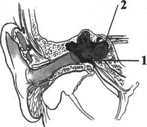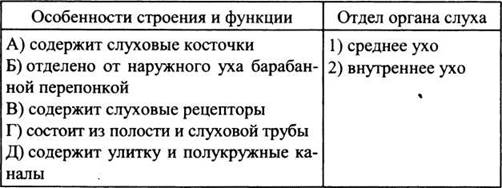 8. Установите соответствие между отделами органа слуха, обозначенными на рисунке цифрами 1, 2, и особенностями их строения и функциями. К каждой позиции, данной в первом столбце, подберите соответствующую позицию из второго столбца.