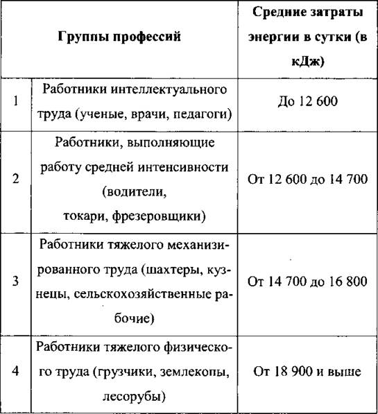 21. Изучите таблицу «Суточная потребность энергии для людей разных категорий труда».