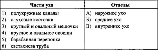 21. Установите соответствие между частями уха и отделами, к которым они относятся.