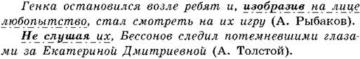 В определенном контексте деепричастие перестает обозначать добавочное действие и переходит в разряд наречий: Стоя у доски, первоклассник с усердием читал стихотворения А. Пушкина — Это упражнение выполняют стоя. Такие наречия легко заменяются синонимом (обычно другим наречием): Мы ехали не останавливаясь по белой равнине (Л. Толстой) — Мы ехали быстро по белой равнине или Мы ехали без остановок по белой равнине. В наречия переходят только деепричастия несовершенного вида, стоящие, как правило, после сказуемого (стоя, лежа, сидя, не спеша, шутя и др.) — Татьяна любит не шутя (А. Пушкин).