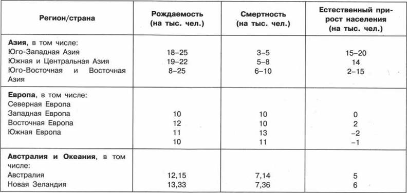 Выделяют два типа воспроизводства населения. Для типа воспроизводства развитых стран характерны средние, низкие показатели рождаемости, естественного прироста, низкие темпы роста населения. Для типа воспроизводства развивающихся стран характерны: высокая рождаемость, снижение смертности, высокие темпы естественного прироста населения. В группе развивающихся стран высокие показатели рождаемости и естественного прироста характерны для населения большинства государств Африки, Западной, Юго-Западной, Южной Азии. Несколько ниже эти показатели в странах Восточной Азии, Латинской Америки (см. табл. 2).