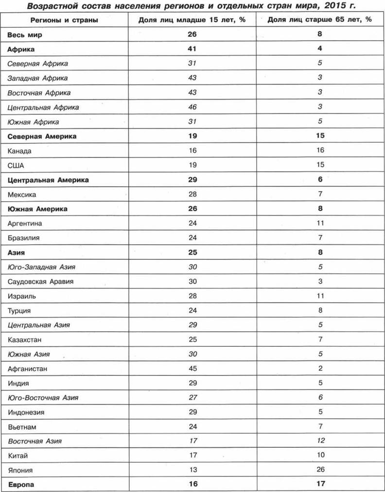 а) в каких регионах мира доля лиц до 15 лет превышает общемировой показатель;