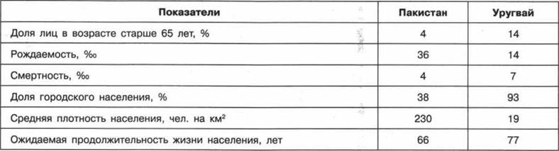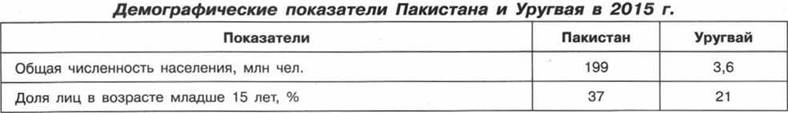 4. В таблице представлены статистические данные, характеризующие население Пакистана и Уругвая. Используя данные таблицы, объясните, почему доля лиц старше 65 лет в возрастной структуре населения в Пакистане меньше, чем в Уругвае. Укажите две причины. Если вы укажете более двух причин, оцениваться будут только две, указанные первыми.