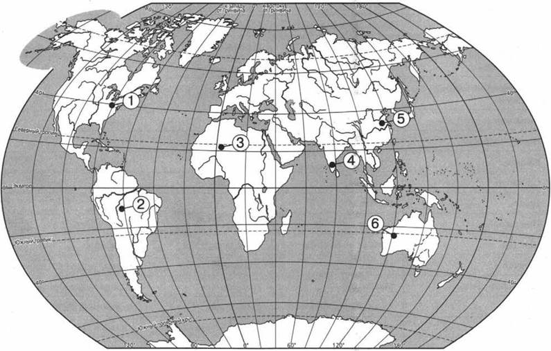 5. Какие три из обозначенных на карте мира территории имеют наименьшую среднюю плотность населения? Запишите в таблицу цифры, под которыми указаны эти территории.