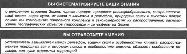 Во внутреннем строении Земли выделяют три основные части — земную кору, мантию и ядро. Литосфера — твёрдая оболочка Земли, включающая земную кору и верхнюю часть подстилающей её верхней мантии Земли. Земная кора — верхняя оболочка «твёрдой» Земли. В земной коре различают 3 слоя — осадочный, гранитный, базальтовый. В гранитном и базальтовом слоях распространены горные породы, похожие по физическим свойствам на гранит и базальт. Под материками земная кора имеет большую мощность, чем под океанами. В материковой земной коре присутствует гранитный слой, а в океанической его нет. Положение слоёв в континентальной коре свидетельствует о разном времени их образования. Базальтовый слой является самым древним, моложе его — гранитный, а самый молодой — осадочный, развивающийся и в настоящее время. Каждый слой коры формировался в течение длительного отрезка геологического времени.
