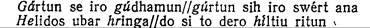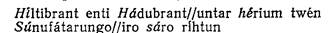 Это четырехударный стих, причем между ударениями может быть разное число неударных (число неударных иногда очень большое). Важно, чтобы было 4 сильных ударения, по два в каждом полустишии. Полустишия связываются между собой аллитерацией, т. е. повторением одинаковых согласных. Основой аллитерации является третье ударение. Оно привязывает второе полустишие к первому, причем эта привязка может быть в одном или в двух местах, т. е. аллитерировать могут два согласных, начинающие собой оба ударных слова в первом полустишии, либо только одно из них. Иными словами, возможна аллитерация первого ударения с третьим, либо второго с третьим, либо первого и второго с третьим. В качестве примера можно привести знаменитую эпическую песню, посвященную сюжету боя отца с сыном «Песнь о Хилтибранте» (Хильдебранде). Здесь говорится о том, как отец и сын стоят между двумя войсками и вступают в поединок. Они вооружились, надели свои панцыри, мечи и вступили в бой: