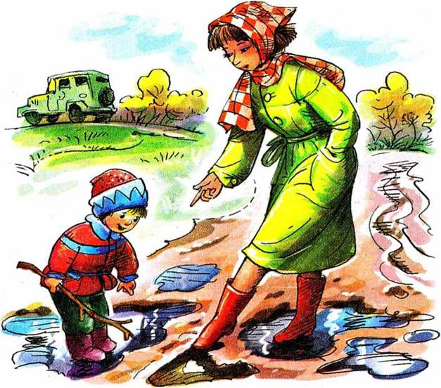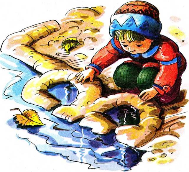 Вода хлынула из лужи, потекла по дороге, всё вниз и вниз в другую лужу, а потом в овраг, из оврага в ручей, из ручья в речку, а уж из речки в далёкое море.