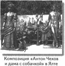 Необычная скульптурная композиция привлекает прохожих на ялтинской набережной. В ней легко узнаётся героиня чеховского рассказа «Дама с собачкой» Анна Сергеевна, которая изображена со своим неизменным спутником — маленьким шпицем. Немного позади, будто наблюдая со стороны, стоит и сам автор.