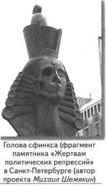В память о жертвах политических репрессий в СССР в 1995 году в Санкт-Петербурге, на берегу Невы, по проекту известного скульптора Михаила Шемякина был создан памятник. Он расположен напротив печально известной тюрьмы «Кресты» и представляет собой двух бронзовых сфинксов со страшными, изъеденными, обнажившимися черепами. Между сфинксами на парапете набережной сооружено и стилизованное окно тюремной камеры с решёткой. Памятник так и называется «Жертвам политических репрессий». Вокруг постаментов — медные таблички, на которых выгравированы строки из произведений А. Солженицына, Н. Гумилёва, О. Мандельштама, А. Ахматовой, В. Шаламова, Д. Лихачёва, И. Бродского, В. Высоцкого и других.