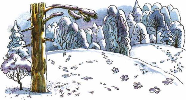 Вот ночью здесь топтался зайчик. Он обглодал кору осинок. Подняв чёрный кончик хвоста, пробежал горностай. Он охотился за птичками и мышами. На лесной опушке видны следы старой лисы. Они похожи на красивую цепочку. По краю опушки, след в след, прошли волки.