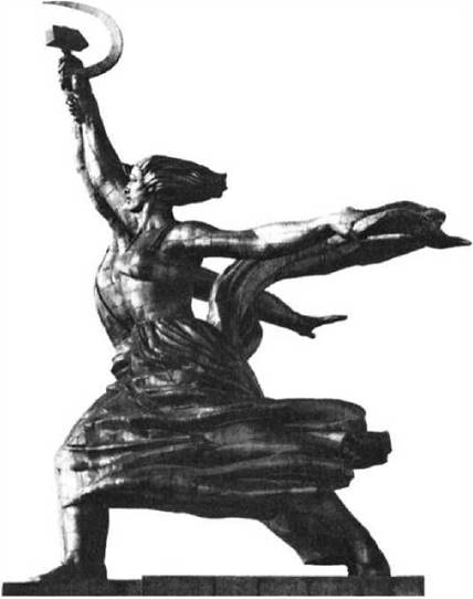 Ярким образом-обобщением созидательного духа эпохи 30-х годов стала, конечно, знаменитая скульптура В.И. Мухиной «Рабочий и колхозница» для советского павильона Всемирной выставки в Париже в 1937 году. Задумайтесь над ее символикой, вовсе не вульгарно-социологической, не производственной: фигуры женщины в русском сарафане с зажатым в руке, отлетающим назад шарфом и рабочего в спецовке с рукой, передающей движение развернутого крыла, — это не тяжелая грузная поступь, а полет, всесокрушающий порыв, легкость, стремительность. В.И. Мухина очень гордилась своей счастливой находкой — шарф передавал движение, встречный ветер, «снимал» даже тяжесть пьедестала, завершал идею движения, полета.