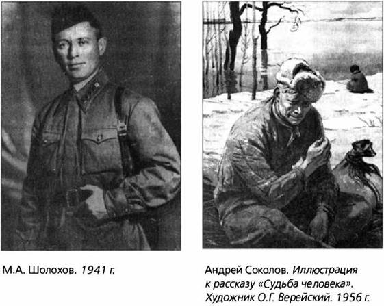 Из впечатлений военных лет вырос позднее и эпический рассказ М.А. Шолохова «Судьба человека» (1956). Бесспорное совершенство этой новеллы, ее удача — в случайном или преднамеренном выборе автором сказовой формы, в трансформации его в подставного рассказчика — простого солдата Андрея Соколова, в предельном упрощении сюжетных коллизий, в развертывании исключительно «биографии переживаний» героя.