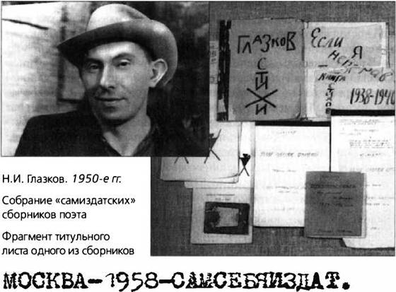 Одним из интереснейших «подпольных» поэтов этой эпохи был Николай Иванович Глазков (1919-1979), придумавший слово «самсебяиздат»: так он называл сброшюрованные им машинописные книжки, которые распространялись «из рук в руки». Противостояние «официальной» печати в неподдельной «рукописности» души поэта осмыслены им отнюдь не в политических категориях: