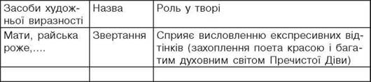 7. Які засоби художньої виразності використовує автор, яку роль вони відіграють у тексті сонета? Заповніть таблицю за поданим зразком.