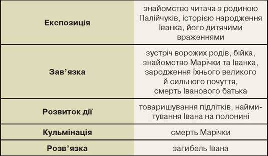 Водночас сюжет і композиція повісті своєрідні. По-перше, М. Коцюбинський вибудовує твір фрагментарно, зупиняючи свою увагу на окремих епізодах із життя Івана. У цьому виявився вплив новелістики письменника (пригадаймо, що прозаїк — неперевершений майстер цієї жанрової форми). Такий підхід сприяв глибшому психологічному розкриттю характеру персонажа, його світовідчуття, емоцій, душевних станів. По-друге, між кульмінацією та розв’язкою — досить значна за обсягом оповідь, тоді як традиційно ці епізоди не роз’єднуються значним часовим відтинком. Це свідома настанова автора, адже для нього важливо не лише зобразити історію щасливого кохання, що закінчилося так несподівано трагічно, а й розкрити внутрішні переживання Івана після втрати Марічки, його вірність їй, його неймовірну тугу й повільне душевне вмирання-самознищення.