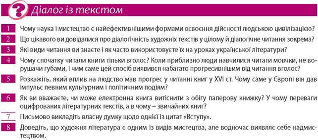 Літературознавець Михайло Бахтін аргументовано довів діалогічність художнього твору. Із читачем дискутує насамперед письменник, подаючи в тексті художнього полотна приховану, відверту чи нейтральну авторську позицію, тобто власне ставлення до літературного персонажа, описаної у творі події, проблеми, яка потребує розв'язання. Літературні герої також, виявляється, своєрідно дискутують один з одним, із самими собою, навіть із читачем, який схвалює чи засуджує їх за певний учинок, помисел чи помилку. Інша річ, що такі підтекстові процеси треба навчитися виявляти в художньому творі.