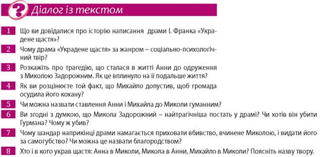 «Украдене щастя» має всі ознаки сімейної драми, а конфлікт у цьому творі - любовний. Автор виявився тонким психологом, тому цей твір варто вважати не соціально-побутовим, а соціально-психологічним. Іще далеко до кривавої розв'язки у драмі страждають усі: і Микола, й Анна, і Михайло. Адже, хоча сусідка Задорожних і вважає їхню сім'ю найщасливішою в селі і в цьому твердженні є велика частка правди, Анна не любить свого чоловіка, а Микола не почувається самодостатнім ані в родинному колі, ані в сільській громаді. Михайло з ревнощів називає суперника «туманом вісімнадцятим», однак Микола ні розумово відсталий, ні примітивний. Його шлюб з убогою, але коханою дівчиною, за якою брати не дали приданого, напевно, був для Анни єдиним порятунком від сімейного гніту й насильства в батьківській родині, яку уособлювали жорстокі, брехливі брати.
