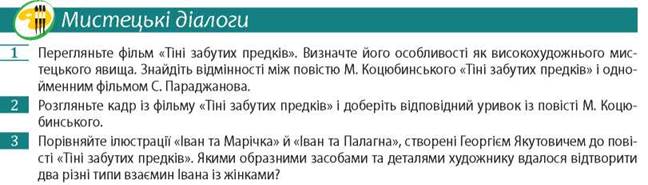 Творчість Михайла Коцюбинського стала новаторським явищем української літератури не тільки тому, що розширила її тематичні обрії. Модерне письмо великого художника слова - це і відповідь на запити часу вивести рідне письменство на загальноєвропейські обрії, і взірець органічно поєднаної техніки імпресіоністичного письма з національною традицією. Його проза утверджує красу життя, прагнення до ідеалу й гармонії, тому є завжди актуальною. Підтвердження цьому - й кінофільм, знятий за мотивами повісті «Тіні забутих предків» у 1964 р. режисером Сергієм Параджановим. Оператор Юрій Іллєнко віртуозно передав пластичні рішення фільму; композитор Мирослав Скорик написав музику - звуковий образ Гуцульщини; Софія Сергієнко - тривожні голоси полонини, шум дощу, гупання загадкової сокири в лісі, «незвичайну звукову та шумову густину фільму, що була важливою складовою його образотворчо-емоційної компоненти» (Іван Дзюба). Звичайно, запорукою успіху кінострічки, реалізації творчого задуму режисера й творчого колективу була талановита гра акторів Івана Миколайчука (Іван) та Лариси Кадочникової (Марічка).