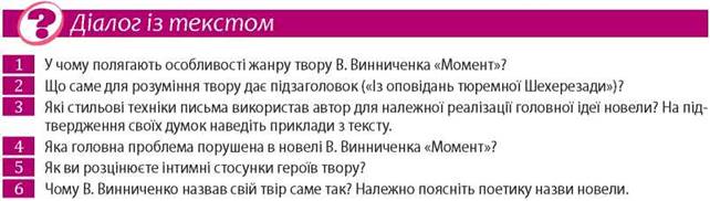 Модерна новела В. Винниченка «Момент» (1910), написана в стилі імпресіонізму, має також виразні елементи неоромантизму й експресіонізму. Підзаголовок «(Із оповідань тюремної Шехерезади)» завжди породжує додаткові асоціації в читачів, а саме: