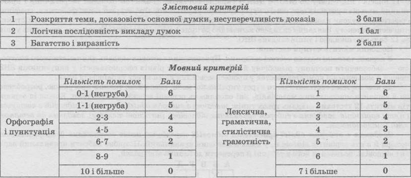 За власне висловлення виставляється одна оцінка. До бала за змістовий компонент додається бал за мовне оформлення. Орфографічні й пунктуаційні помилки обраховують разом і оцінюють однаково. Лексичні, граматичні, стилістичні помилки обраховують разом і оцінюють однаково.