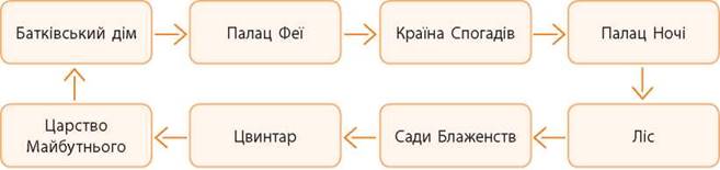 Подорожуючи до Країни Спогадів, Палацу Ночі, Лісу, Саду Блаженств, на Цвинтар, у Царство Майбутнього, діти зустрічаються з алегоричними героями. Кожен із них наділений власним смислом, несе свою частину загальнолюдської моралі. Зустрічі з цими дійовими особами стають етапами морального виховання і зростання дітей.