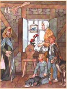 Сусідці, дуже схожій на Фею, Тільтіль подарував для хворої онуки свою сіру горличку, і птах став синім. Так хлопчик пізнав Блаженство Бути Добрим. Отже, і в злиденній хатині дроворуба живуть добрі Блаженства, і найпрекрасніше з них — Блаженство Материнської Любові. «Із заплющеними очима цього не побачиш. Усі матері багаті, якщо люблять своїх дітей. Нема ні бідних матерів, ні некрасивих, ні старих. їхня любов незмінно є найчарівнішою з усіх Радощів. Коли ж вони сумують, варто їм поцілувати дитину, варто дитині поцілувати їх — і всі сльози, що підступають до їхніх очей, перетворюються на зірки.» — зрозуміли діти.