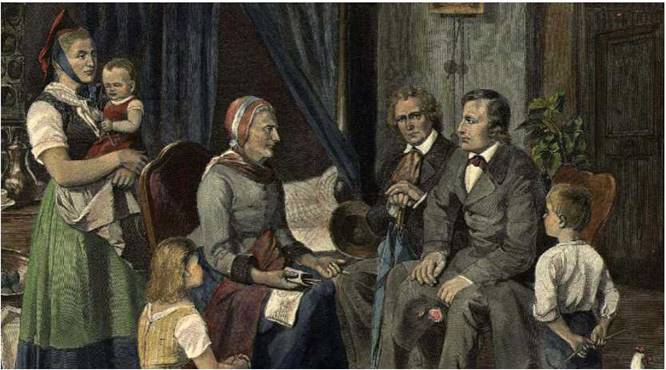 Не менше вразило уяву німців видання в 1812 році «Дитячих і сімейних казок» — збірки німецьких народних казок, яку впорядкували видатні фольклористи- дослідники брати Якоб та Вільгельм Грімм (згадайте казки «Пані Метелиця» і «Бременські музики», які ви читали в 5 класі).