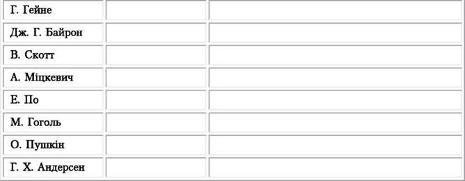 У подану таблицю навпроти першої колонки із прізвищами митців-романтикв у другій колонці впишіть назву країни, яку вони представляють, а в третій — назви їхніх романтичних творів, вивчених вами в попередніх класах. Прокоментуйте дібрані приклади.