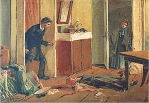 Випадково в трактирі він став свідком розмови між студентом та офіцером. Слова студента стосувалися старої лихварки Альони Іванівни: «Убий її й візьми гроші для того, щоб з їхньою допомогою присвятити потім себе служінню всьому людству й загальній справі. Як ти думаєш, чи не виправдається один невеличкий злочин тисячами добрих вчинків?» (Переклад І. Сергєєва). Ці погляди відповідали «теорії» Раскольникова про надлюдину, якій усе дозволено, навіть «кров по совісті».