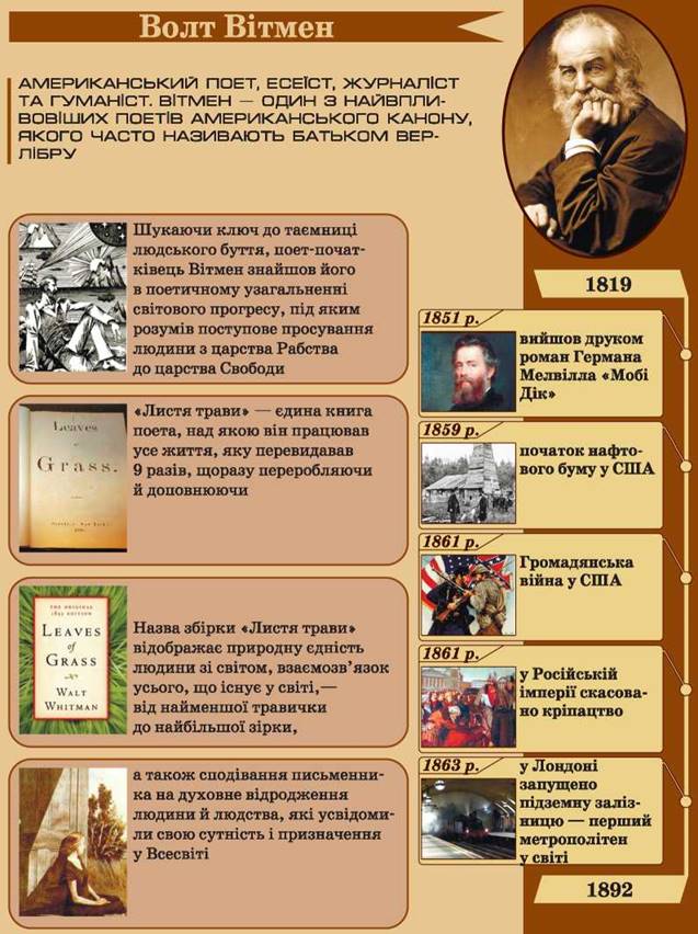 За інфографікою та іншими джерелами інформації (інтернет- ресурсами, сучасними енциклопедіями) складіть візитівку за темою «Вітмен — один із найвпливовіших американських поетів доби романтизму».