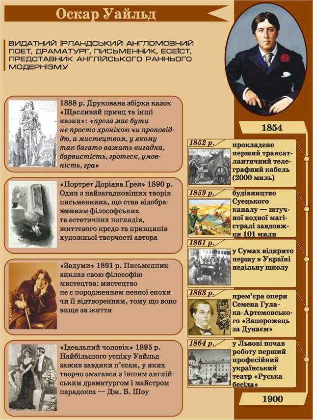 • За інфографікою та іншими джерелами інформації (інтернет- ресурсами, сучасними енциклопедіями) схарактеризуйте особливості творчості Оскара Уайльда.