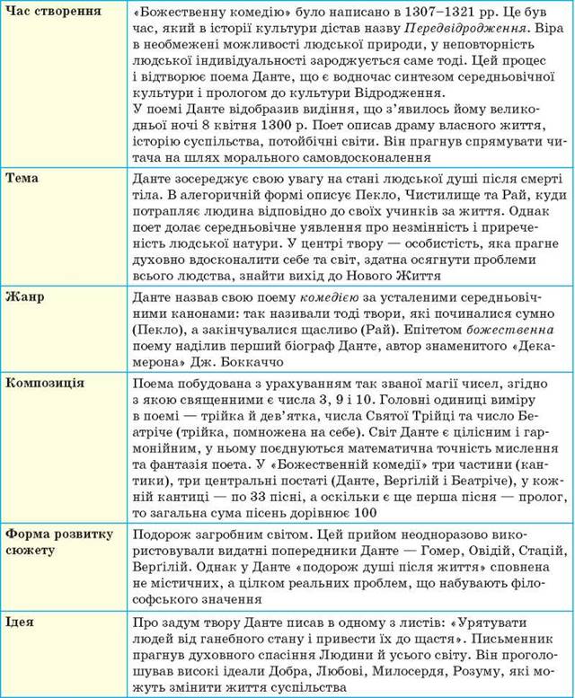 У цьому творі, що став підсумком усього Дан- тового життя, подано широку картину тогочасних уявлень про світ, що переплітаються з пропагуванням автором важливих для нього ідей. Задум поеми, її композиція обумовлені системою тогочасних знань, містично-богословськими теоріями, характерними для духовного життя поета, і середньовічною поетикою.