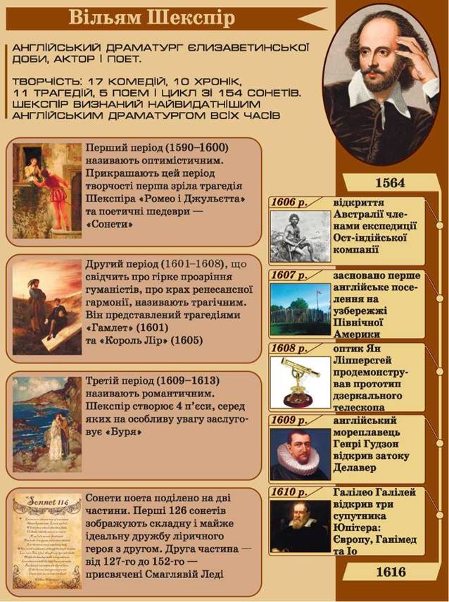 • За інфографікою та іншими джерелами інформації (інтернет-ре- сурсами, сучасними енциклопедіями) складіть повідомлення за темою «Вільям Шекспір — видатний драматург доби Відродження».