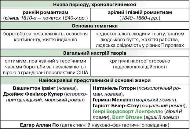 4. Проаналізуйте таблицю «Періодизація літератури американського романтизму» (див. с. 139). Поясніть, чому творчість Едгара Аллана По представлено окремою графою, а прізвища Вітмена і Лонгфелло виділено іншим кольором?